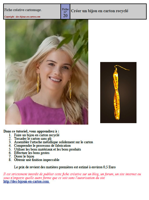 De jolies boucles d'oreilles en carton. Pas possible? Mais si, mais si! Un peu de patience, quelques secrets de fabrication que je dévoile dans ce tutoriel, de la méthode et ... en moins d'une heure, vous aurez créé ce magnifique bijou. Mais chut! Ne dites à personne que c'est du carton car personne ne le verra ... sauf si vous êtes fier d'être cartonniste et que vous voulez surprendre vos amies ! Attention cependant! Elles vous demanderont sûrement d'en fabriquer pour elles, alors, anticipez et fabriquez-les en série ...